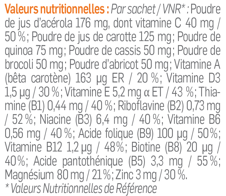 Maltodextrine, citrate de magnésium, sucre de canne, poudre de jus d’acérola (Malpighia glabra, fruit) et vitamine C, poudre de jus de carotte (Daucus carota, racine), poudre de quinoa (Chenopodium quinoa, germe), poudre de cassis (Ribes nigrum, fruit), poudre de brocoli (Brassica oleracea, partie aérienne), poudre d’abricot (Prunus armeniaca, fruit), arôme naturel, gluconate de zinc, acide folique (vitamine B9), antiagglomérant : mono- et diglycérides d’acides gras, niacine (vitamine B3), vitamine E, bêta-carotène (vitamine A), acide pantothénique (vitamine B5), édulcorant : glycosides de stéviol issus de Stévia, biotine (vitamine B8), vitamine B12, riboflavine (vitamine B2), vitamine B6, vitamine D3, thiamine (vitamine B1).